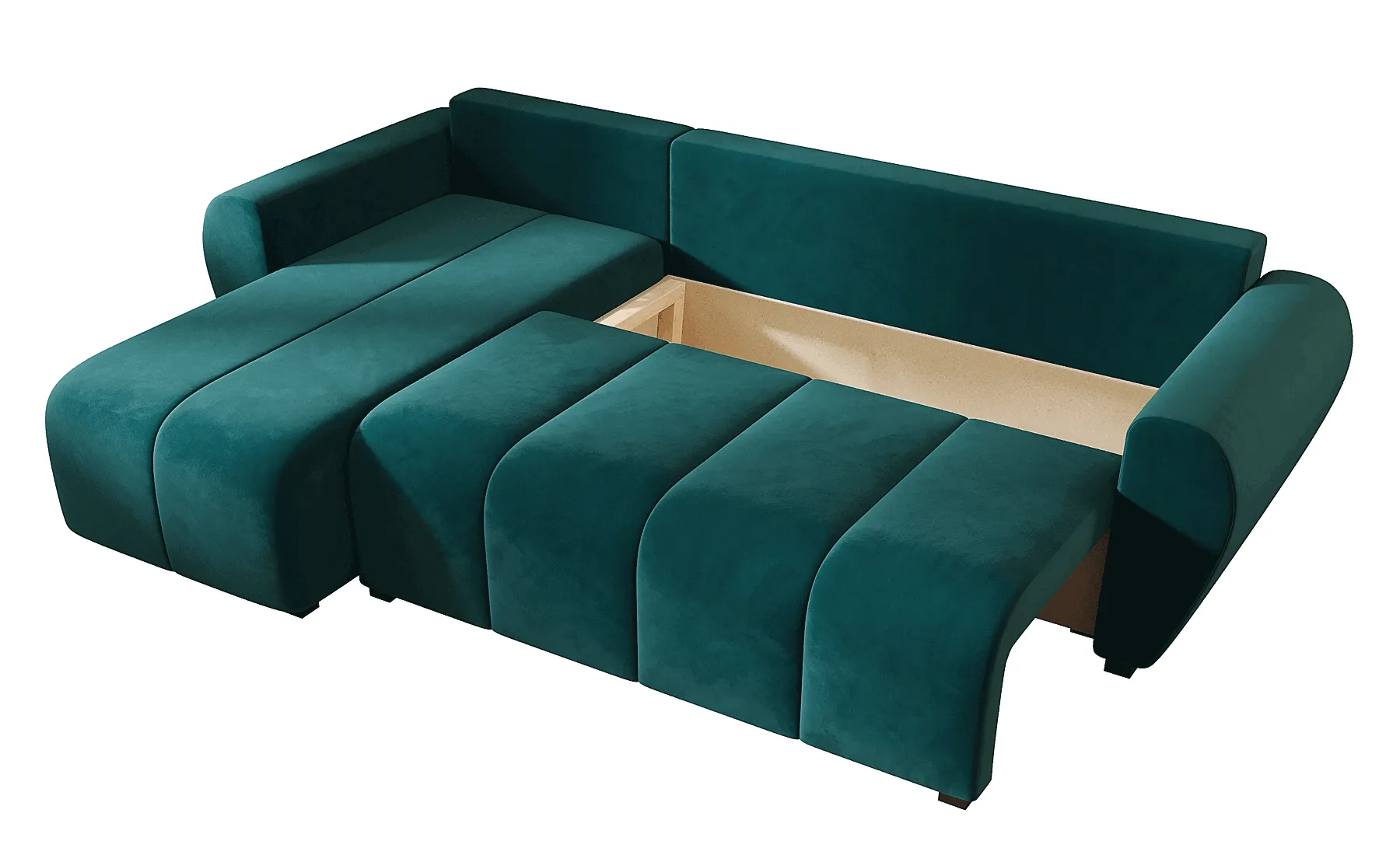 Narożnik rozkładany Velmores 4X to esencja stylu i wygody, stworzona dla osób, które cenią sobie funkcjonalność w eleganckiej oprawie. Jego miękkie linie i zaokrąglone boki sprawiają, że prezentuje się lekko i nowocześnie, stając się wyjątkową ozdobą salonu. Dzięki dużym poduszkom zapewnia komfort codziennego odpoczynku, a przemyślana konstrukcja gwarantuje, że czas spędzony na nim zawsze będzie przyjemnością. Funkcja spania pozwala w kilka chwil zamienić narożnik w wygodne łóżko, idealne na co dzień lub podczas wizyty gości. Dodatkowo narożnik wyposażono w praktyczny pojemnik na pościel, dzięki czemu utrzymanie porządku w salonie staje się dużo prostsze. Velmores 4X łączy w sobie elegancki design, funkcjonalność i trwałość, czyniąc z niego inwestycję na lata.
