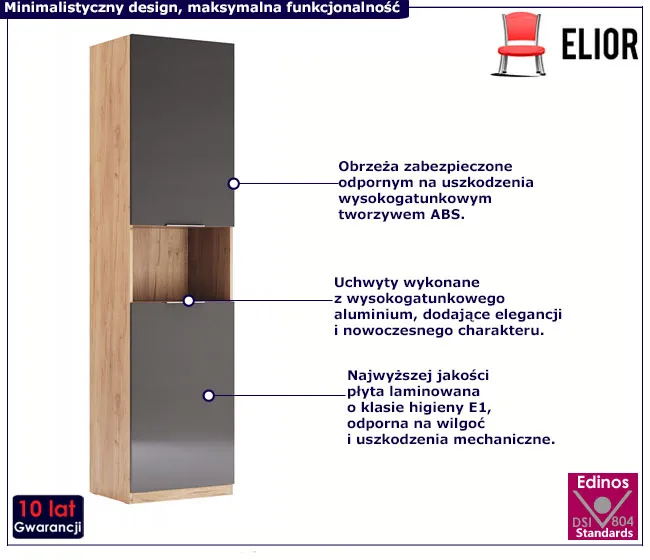• Produkt posiada certyfikat jakości "Edinos Standards DSI 804", który potwierdza najwyższą jakość wykonania mebla oraz pełny stopień zgodności poszczególnych jednostek wytworzonego wyrobu z przyjętym wzorcem.
