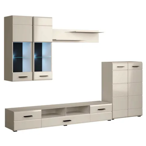 Zestaw ma bardzo przemyślany układ - komoda, szafka RTV, witryna i półka sprawiają, że można sensownie zagospodarować salon. Meble wyglądają nowocześnie i są funkcjonalne, także całość na duży plus.