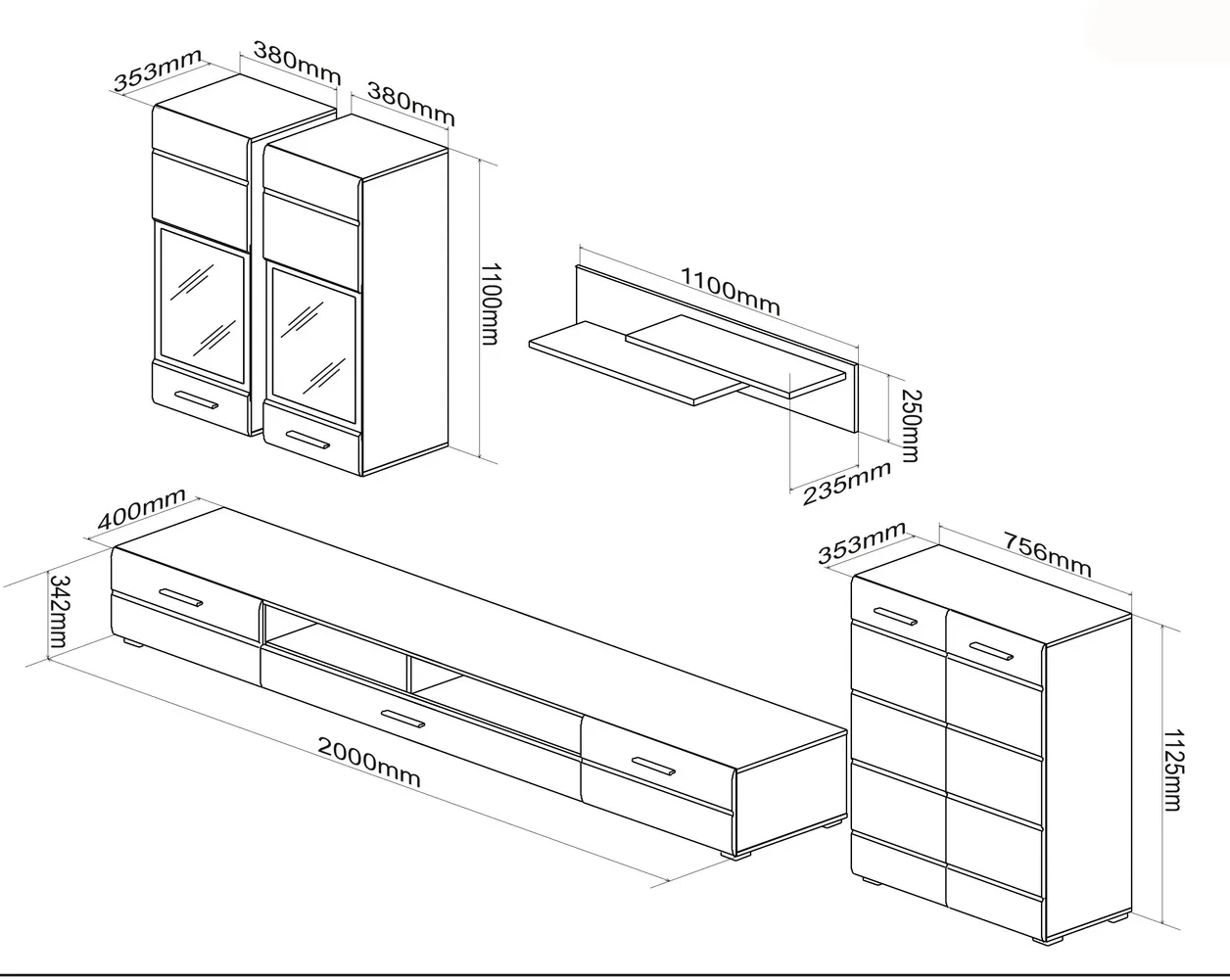• Przemyślany układ brył – w skład zestawu wchodzi pojemna komoda, praktyczna szafka RTV, elegancka witryna wisząca oraz funkcjonalna półka. Każdy element można ustawić według własnego uznania, tworząc układ dopasowany do metrażu pomieszczenia.