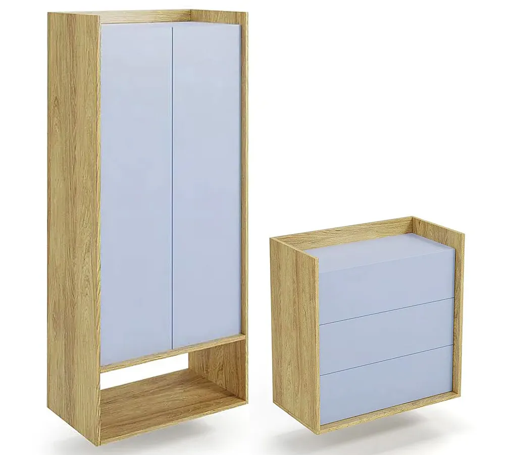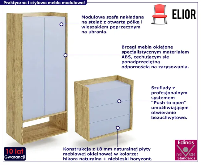 Szafę i komodę z zestawu Tomox stworzyliśmy z najwyższej jakości 18 mm ekologicznej okleinowanej płyty meblowej o klasie higieny E1. Płyta meblowa została zbudowana z włókien drzewnych i związków organicznych w warunkach wysokiego ciśnienia i temperatury. Włókna ułożone są różnokierunkowo, co podnosi parametry wytrzymałościowe i jakościowe surowca. Dodatkowo, w celu zwiększenia trwałości, płytę uszlachetniliśmy cienkimi filmami melaminowymi. Obrzeża mebli starannie okleiliśmy specjalistycznym tworzywem ABS o zwiększonej odporności na ścieranie i wilgoć. Za podwójnymi drzwiami znajduje się porzeczny drążek na wieszaki z miejscem na sukienki maxi, ubrania wizytowe i płaszcze. W dolnej części umieściliśmy ażurową półkę, która nadaje meblowi wizualnej lekkości, a przy tym doskonale wyeksponuje dekoracje lub estetyczne pojemniki na akcesoria, dodatki. Drzwi szafy oraz szuflady od komody wyposażone zostały w system Push to open, dzięki czemu otwierają się bezproblemowo po lekkim naciśnięciu frontu. Montaż zarówno szafy jak i komody z zestawu Tomox jest wyjątkowo łatwy. Wystarczy dobrać 2 stelaże Horizonte 16X i umieścić na nich mebel. Nowoczesny zestaw szafa i komoda Tomox marki Edinos Premium zachwyci Cię nieziemską jakością i funkcjonalizmem.