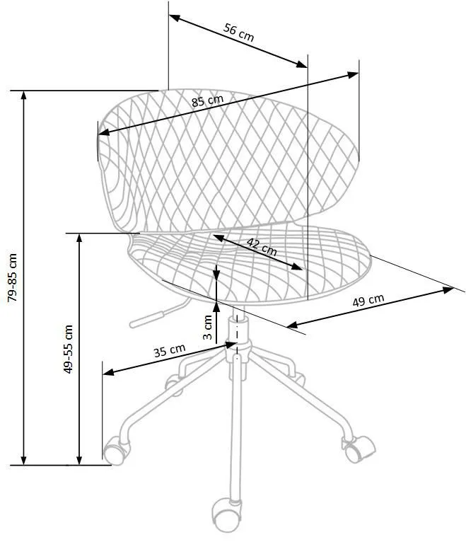 • Wymiary: wysokość całkowita: 79-85 cm, wysokość siedziska: 49-55 cm, głębokość mebla: 56 cm, głębokość siedziska: 42 cm,  szerokość mebla: 85 cm, szerokość siedziska: 49 cm.