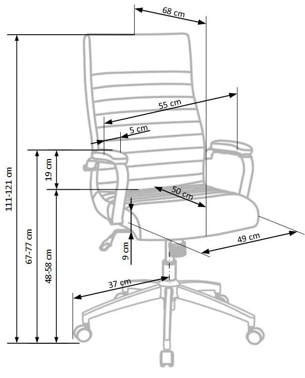 • Wymiary: wysokość całkowita: 111-121 cm, wysokość siedziska: 48-58 cm, głębokość mebla: 68 cm, głębokość siedziska: 50 cm, szerokość mebla: 55 cm, szerokość siedziska: 49 cm.