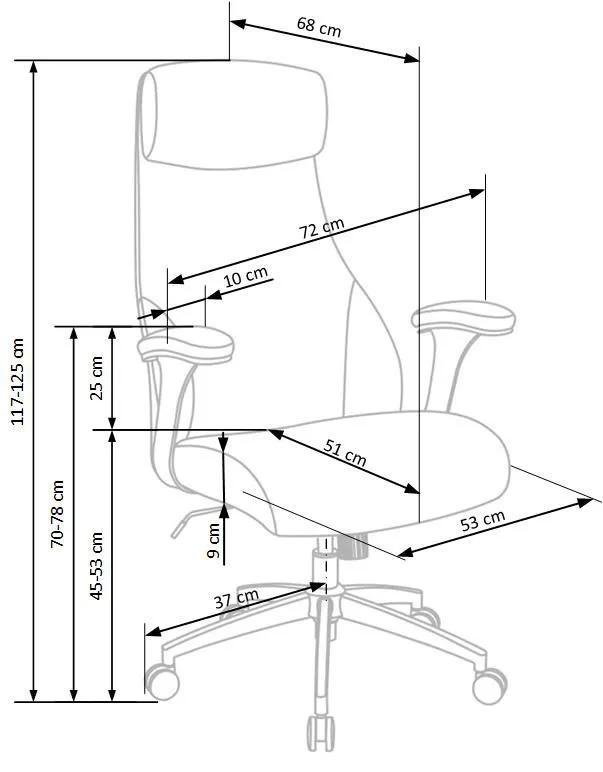 • Wymiary: wysokość całkowita: 117-125 cm, wysokość siedziska: 45-53 cm, głębokość mebla: 68 cm, głębokość siedziska: 51 cm,  szerokość mebla: 72 cm, szerokość siedziska: 53 cm.