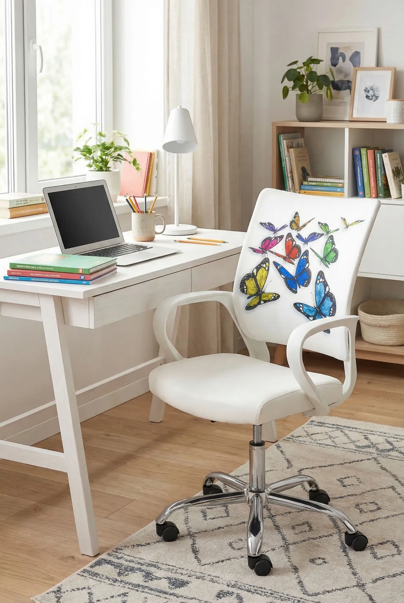 Fotel wygląda bardzo ładnie i młodzieżowy motyw z motylami fajnie ożywia pokój. Obrotowa podstawa działa sprawnie, a siedzisko daje dobre podparcie przy biurku, więc praca czy nauka staje się bardziej komfortowa. Kolor biały dobrze komponuje się z resztą mebli i ogólnie fotel robi dobre wrażenie.