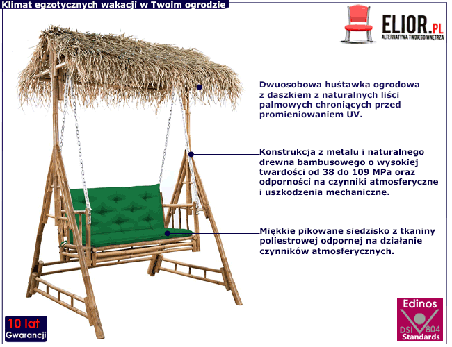 Unikatowa huśtawka Amar marki Edinos Premium to świetny pomysł na wyjątkową aranżację ogrodowej strefy wypoczynku.  Do produkcji huśtawki Amar wybraliśmy naturalne  materiały o najwyższych parametrach jakościowych i użytkowych. Konstrukcja powstała z drewna bambusowego  metalu. Bambus jest jednym z najtwardszych drewien na kuli ziemskiej, jego twardość przewyższa rodzime i egzotyczne  gatunki drewna i wynosi od 38 do 109 MPa. Dzięki wysokiej twardości bambus jest wyjątkowo odporny na uszkodzenia mechaniczne, zadrapania i zarysowania. Dzięki dużej stabilności drewna bambusowego meble wykonane z tego surowca są odporne na działanie czynników atmosferycznych, nie kurczą się i nie pęcznieją nawet w miejscach o dużej wilgotności, dlatego doskonale sprawdzają się na trasie i w ogrodzie. Charakteryzują się bardzo wysoką trwałością, wytrzymałością, elastycznością i  lekkością. Ergonomiczne siedzisko zostało zamocowane na metalowych łańcuchach, aby zapewnić maksymalne bezpieczeństwo. Miękkie pikowane poduszki z trwałej tkaniny oferują wysoki poziom komfortu podczas odpoczynku. Każda poduszka zawiera dwa zestawy sznurków, które utrzymują je na miejscu, zapobiegając przesuwaniu. Daszek huśtawki Amar pokryliśmy plecionką z naturalnych liści palmowych. Tak zaprojektowany daszek stanowi bezpieczną osłonę przed szkodliwym promieniowaniem UV, a dzięki zastosowaniu naturalnego surowca nadaje meblowi wybitnie dekoracyjnego efektu w tropikalnym stylu. Tak wykonana huśtawka Amar marki Edinos Premium przetrwa wiele letnich sezonów, bez konieczności wymiany i zapewni fenomenalny relaks. Postaw bambusową huśtawkę Amar w ogrodzie i poczuj się w nim jak na rajskiej wyspie już teraz!