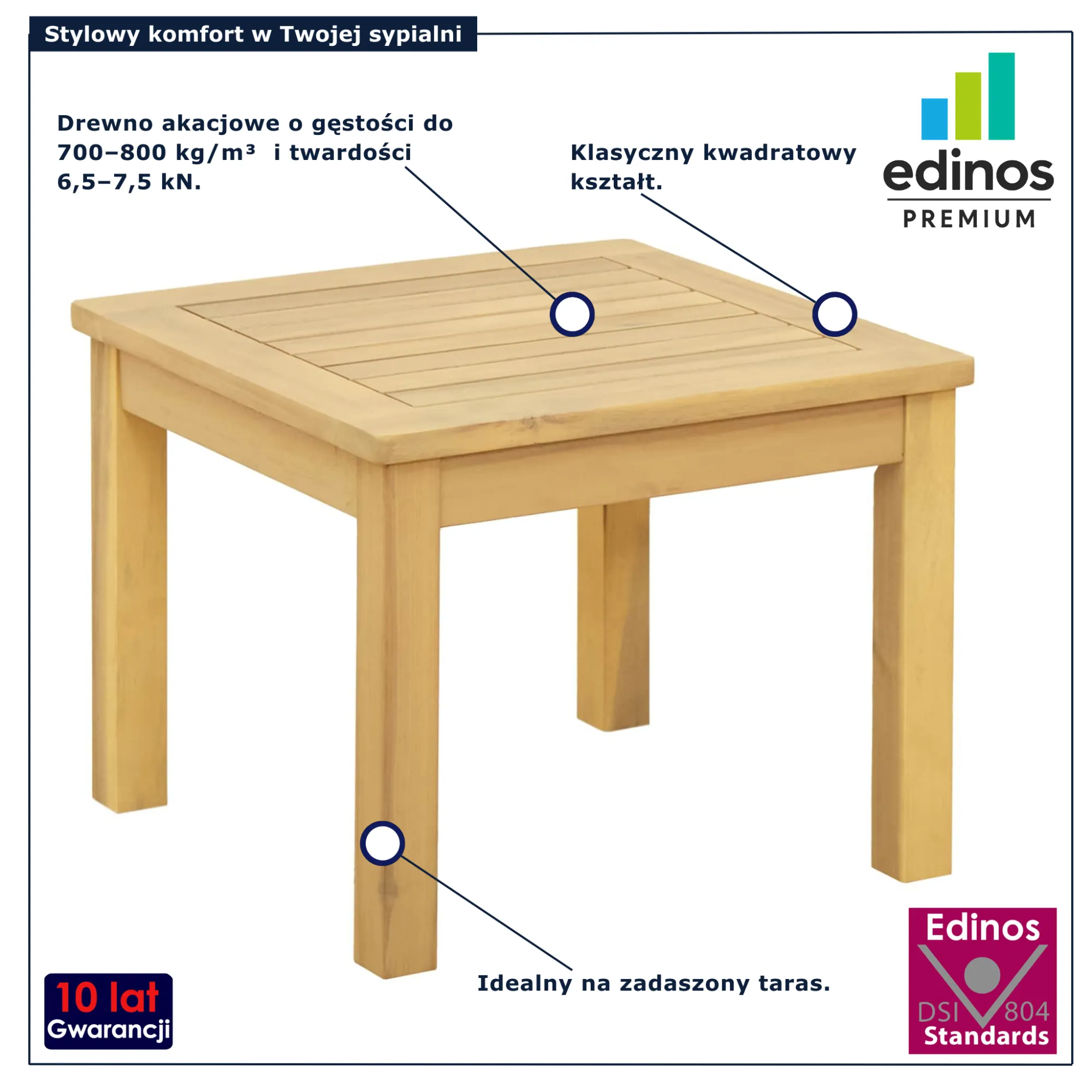 Przenoś się w czasie i przestrzeni, odkrywając zakątki Twojego ogrodu, gdzie mały stolik kawowy Egle 5X marki Edinos Premium staje się symbolem spokoju i elegancji. W otoczeniu zieleni i śpiewu ptaków, ten uroczy stolik staje się nieodłącznym elementem Twojej ogrodowej oazy. Wykonany z drewna akacjowego, emanuje naturalnym ciepłem, tworząc atmosferę sprzyjającą relaksowi i chwilom refleksji. Jego minimalistyczny design i klasyczny wygląd doskonale komponują się z każdym stylem ogrodu, dodając mu wyjątkowej harmonii i subtelnej elegancji. Pozwól Egle 5X stać się Twoim wiernym towarzyszem w codziennych rytuałach kawowych na świeżym powietrzu, inspirując do tworzenia niezapomnianych chwil w zgodzie z naturą. Czas wyrwać się z pędu codzienności i zanurzyć się w spokojnej atmosferze, delektując się chwilami spędzonymi w otoczeniu tego wyjątkowego stolika kawowego.
