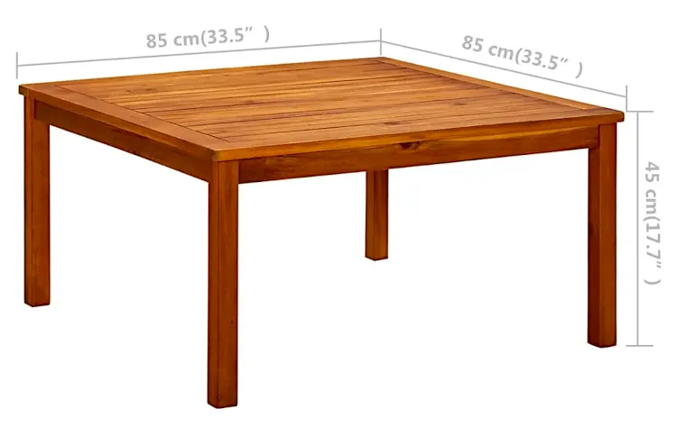• Wymiary stołu: szerokość: 85 cm, głębokość: 85 cm, wysokość 45 cm.