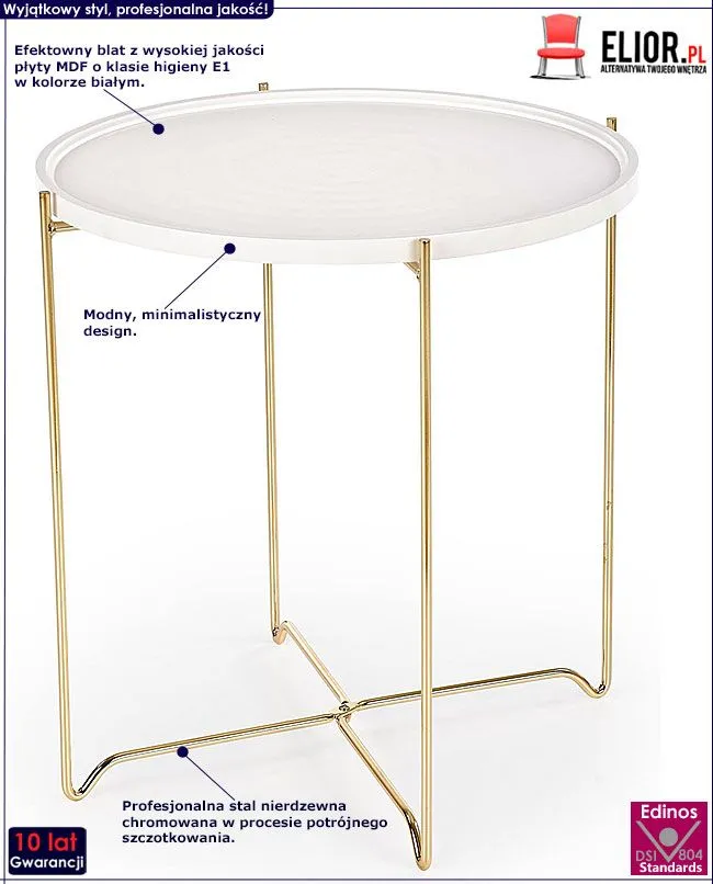 - Kolor: Konstrukcja złota, blat stolika w kolorze białym. Kliknij w link i sprawdź także inne okrągłe stoliki w sklepie Edinos.pl. Stwórz swój praktyczny zestaw mebli.