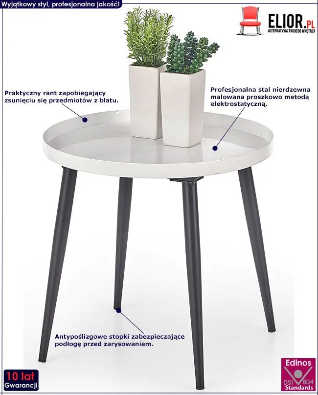 Komfortowa i efektowna ława Armis wyróżnia się nie tylko swoją niebanalną formą i praktycznym kształtem, ale profesjonalnym wykonaniem. To dlatego cieszy się ona powodzeniem wśród osób wybierających niebanalne rozwiązania. Oryginalna w formie, czarna konstrukcja ławy wykonana została z najwyższej jakości nierdzewnej stali malowanej proszkowo odpornym na zarysowania i zadrapania. Najwyższa jakość techniki polimeryzacji pozwoliła zaoferować firmie Elior aż 10 lat gwarancji na swoje produkty. Już nie musisz się martwić, że po kilku latach część farby odpryśnie od mebla . Designerski, okrągły blat ławy w kolorze białym wyposażono w podwyższony rant, który sprawia, że filiżankom z gorącą kawą nie grozi zsunięcie się nawet w obecności małych dzieci czy ciekawskich kotów. Stonowana kolorystyka i prosta, współczesna forma sprawiają, że stolik kawowy Armis doskonale sprawdza się we wnętrzach urządzonych zarówno w stylu nowoczesnym, jak też minimalistycznym czy industrialnym. Ława Elior nadaje wnętrzu harmonii i modnego świeżego designu, a każdy łyk kawy przy niej wypity pozwala Ci odetchnąć od codziennego zgiełku i pośpiechu. Nadaj Twojemu wnętrzu wyrazistego designu w ekspresyjnym, nowatorskim stylu z okrągłym stolikiem kawowym Armis!