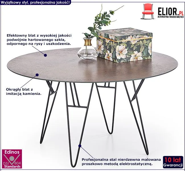 - Kolor: Blat mebla brązowy z efektem kamienia, konstrukcja w kolorze czarnym. Kliknij w link i sprawdź także inne okrągłe ławy w sklepie Edinos.pl. Stwórz swój praktyczny zestaw mebli.