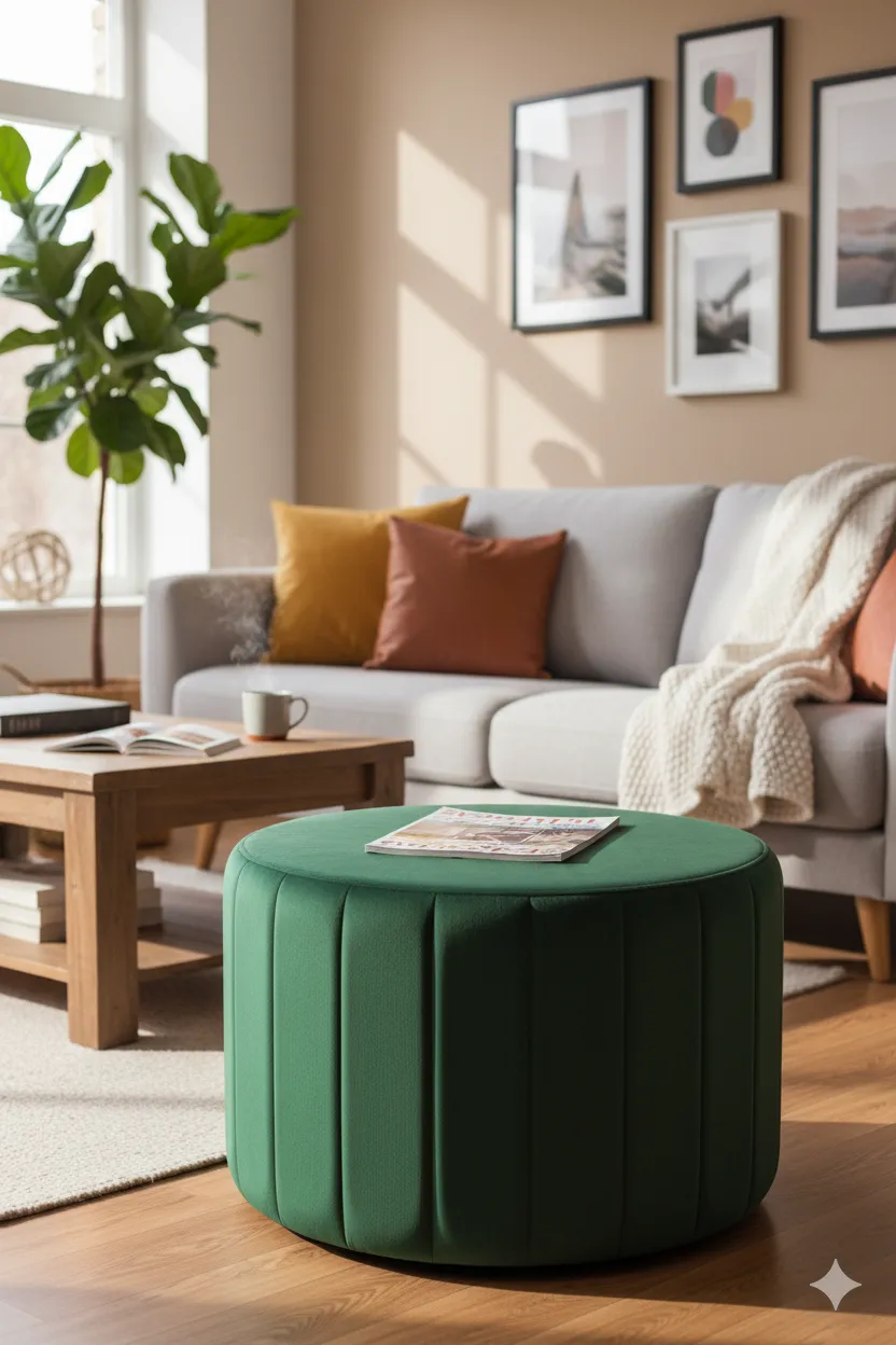 Welur gruby, miły w dotyku, a okrągły kształt idealnie wpasowuje się w przestrzeń przy kanapie. Nogi drewniane dodają ciepła, całość stabilna i nie przesuwa się po panelach. Wygląda drożej niż kosztuje.