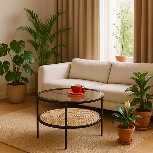 - Okrągły blat o średnicy 60 cm – idealny do postawienia filiżanek, przekąsek lub dekoracyjnych dodatków.