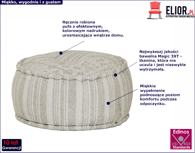Przedstawiany przez nas mebel charakteryzuje się oryginalnym, nietypowym wzorem, oznacza to, że poza funkcją mebla stanie się on także elementem dekorującym wnętrze Twojego domu. Okrągłe siedzisko to klasyczna wersja pufy, jednak ten model przełamuje klasykę i nudę swoim nietypowym wzorem. Miękki, bawełniany materiał wykorzystany do obszycia podnóżka zaciekawi każdego kto Cię odwiedzi. Oryginalny układ przeróżnych kształtów rozmieszczonych na siedzisku oraz pionowe, nieregularne pasy znajdujące się na bocznej części mebla to połączenie, które zniszczy banalne i monotonne podejście do aranżacji wnętrza. Nie lubisz jednostajnych wnętrz, w których długi nic się nie zmienia? Dzięki przyjemnej i delikatnej kolorystyce dopasujesz pufę Armir do każdego pomieszczenia w Twoim domu. Wprowadź niewielką zmianę w swoim domu, która przełamie nudę i stałość Twojego otoczenia.