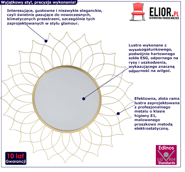 Nasza najnowsza propozycja dekoracyjna Molia została zaprojektowana starannie i szlachetnie – tak, by mogła służyć swoją piękną prezencja i wygodą użytkowania na lata. Główną zasługą doskonałego wykonania złotego lustra Molia jest dobór odpowiednich surowców. To widać już na pierwszy rzut oka, że Molia zaprojektowano naprawdę profesjonalnie! Retro lustro Molia powstało z wysokogatunkowego, podwójnie hartownego szkła , odpornego na rysy i uszkodzenia. Ponadto szkło wykazujące znaczną odporność na wilgoć i nawet po długim użytkowaniu nie traci swoich właściwości. Ozdobna, oryginalna rama lustra została wykonana została wykonana z profesjonalnego metalu o klasie higieny E1, malowanego proszkowo metodą elektrostatyczną Zestawienie tych świetnych surowców sprawia, że lustro Molia prezentuje się efektownie, a zarazem harmonijnie i subtelnie. Ponadto charakteryzuje się trwałością, odpornością na rysy oraz łatwością w czyszczeniu. Przepiękne lustro okrągłe Molia nie tylko stanowi doskonałą dekorację wnętrza, lecz pełni również inne funkcje – sprawia, że pomieszczenie wydaje się większe i znacznie jaśniejsze. Nie wiesz, jak rozpogodzić ciemną, ciasną przestrzeń? Powieś w niej glamour lustro Molia w złotej ramie imitującej kwiat! Jego czysta linia oraz skandynawska klasa sprawiają, że przestrzeń staje się słoneczna, optymistyczna, pogodna i wyrazista. Design pełen przejrzystości, estetycznej klarowności i nieprzeciętnej harmonii? To wszystko zapewni Ci nasze szykowne lustro Molia! Dobrze dobrane, szlachetne lustro pomoże Ci wydobyć ze swojego wnętrza indywidualny, wyjątkowy styl. Rozjaśni je, nada mu nowoczesnej klasy i designerskiego szyku. Pozwól sobie na aranżacyjną kreatywność i wnętrzarski funkcjonalizm z wysmakowanym, misternie wykonanym lustrem Molia!
