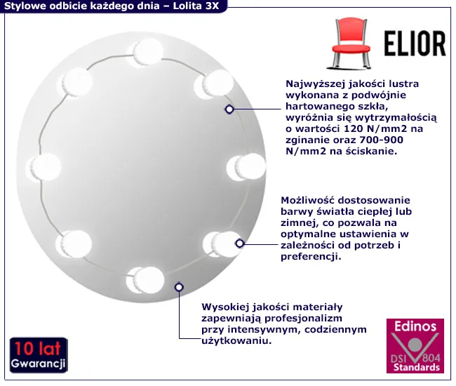Wyobraź sobie poranki, kiedy przygotowujesz się do dnia, otoczona blaskiem, który nie tylko oświetla, ale też inspiruje i motywuje. Lustro Lexus 3X od Edinos Premium to więcej niż tylko lustro — to osobisty asystent stylu, który zaprasza Cię do świata pełnego blasku i elegancji.  Dostępne w wielu rozmiarach, można dopasować do każdej przestrzeni, od intymnych sypialni po przestronne łazienki. Niezależnie od tego, czy potrzebujesz mocnego światła, czy delikatnego błysku Lexus 3X z łatwością spełnia obie te funkcje. Gładka powierzchnia lustra szybko i bez problemu odzyskuje blask, co pozwala na zachowanie czystości nawet przy intensywnym użytkowaniu. To lustro nie tylko ułatwi Twoje codzienne rytuały, ale również stanie się punktem centralnym dekoracji każdego pomieszczenia, przyciągając wzrok i zaciekawienie gości.