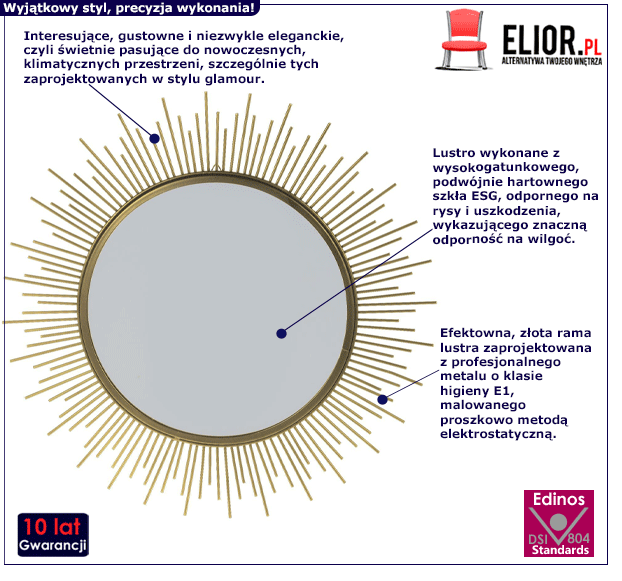 Szykowne, wyjątkowe lustro Temida zostało zaprojektowane starannie i szlachetnie – tak, by mogła służyć swoją piękną prezencja i wygodą użytkowania na lata. Główną zasługą doskonałego wykonania lustra Temida jest wybór odpowiednich surowców. To widać już na pierwszy rzut oka, że lustro Temida zaprojektowano naprawdę profesjonalnie! Vintage lustro Temida powstało z wysokogatunkowego, podwójnie hartownego szkła , odpornego na rysy i uszkodzenia. Ponadto szkło wykazujące znaczną odporność na wilgoć oraz odporność na wysoką temperaturę i nawet po długim użytkowaniu nie traci swoich właściwości. Rama lustra została wykonana z profesjonalnego metalu o klasie higieny E1, malowanego proszkowo metodą elektrostatyczną. Wybór tych właśnie surowców sprawia, że lustro Temida prezentuje się efektownie, a zarazem harmonijnie i subtelnie. Ponadto charakteryzuje się trwałością, odpornością na rysy oraz łatwością w czyszczeniu. Przepiękne, glamour lustro Temida nie tylko stanowi doskonałą dekorację wnętrza, lecz pełni również inne funkcje – sprawia, że pomieszczenie wydaje się większe i znacznie jaśniejsze. Nie wiesz, jak rozpogodzić ciemną, ciasną przestrzeń? Powieś w niej szlachetne lustro okrągłe Temida! Jego czysta linia oraz minimalistyczna klasa sprawiają, że przestrzeń staje się słoneczna, optymistyczna, pogodna i wyrazista. Design pełen przejrzystości, estetycznej klarowności i nieprzeciętnej harmonii? To wszystko zapewni Ci nasze wysublimowane lustro ze zdobieniem Temida imitujące kształtem słońce! Dobrze dobrane, szlachetne lustro pomoże Ci wydobyć ze swojego wnętrza indywidualny, wyjątkowy styl. Rozjaśni je, nada mu nowoczesnej klasy i designerskiego szyku. Pozwól sobie na aranżacyjną kreatywność i wnętrzarski funkcjonalizm z wysmakowanym, misternie wykonanym lustrem Temida!