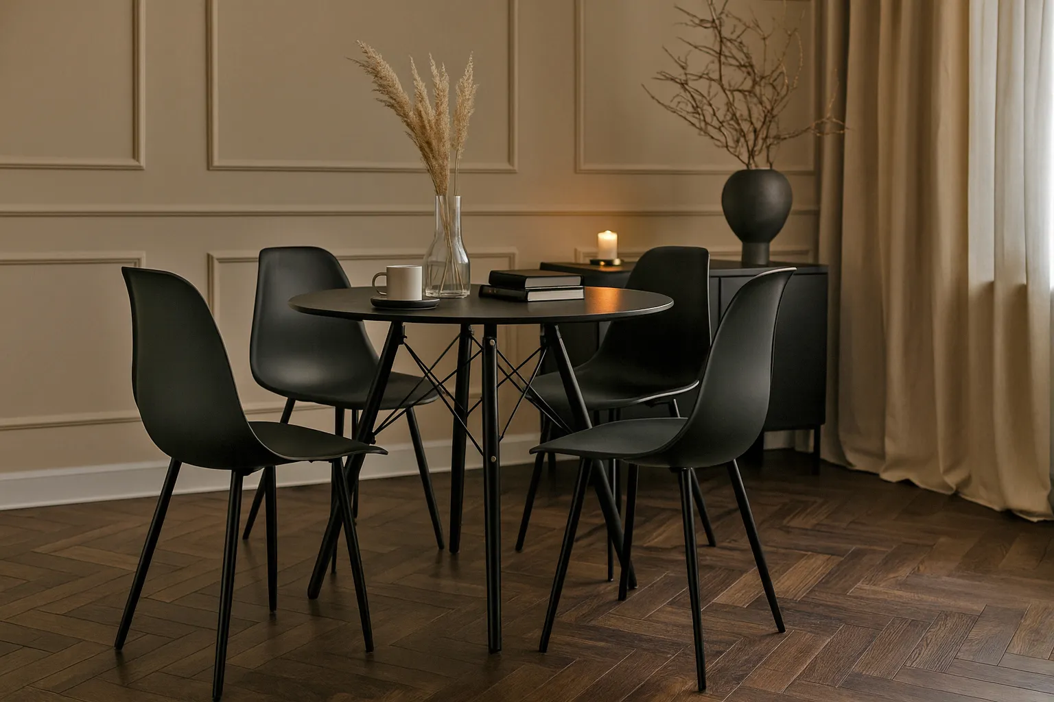 • Ponadczasowa forma – prosty design w eleganckiej czerni sprawia, że zestaw świetnie odnajdzie się w nowoczesnych aranżacjach salonu, jadalni czy kuchni.
