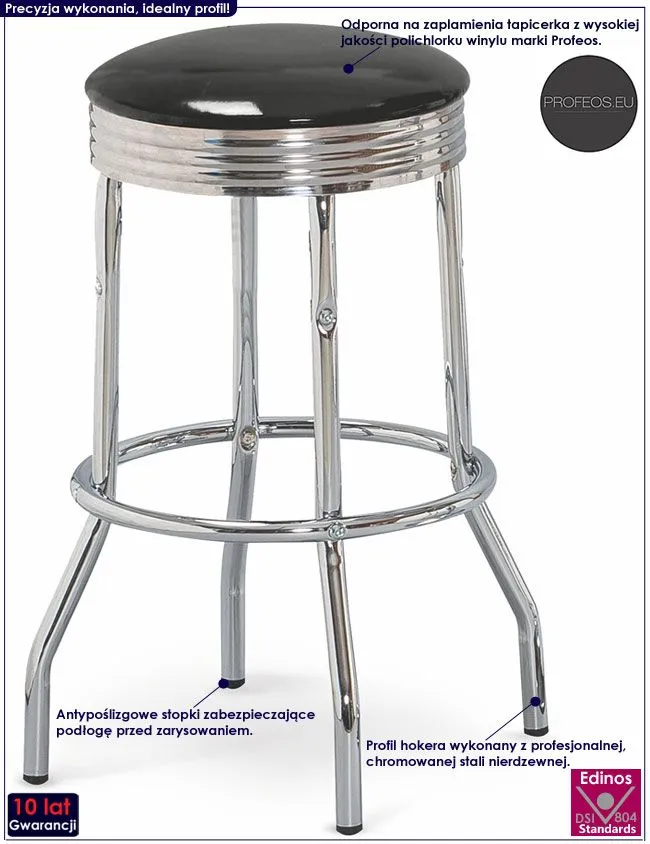 Komfortowy taboret Kalga wyróżnia się nie tylko swoją unikalną formą, ale także zastosowaniem materiałów najlepszej jakości. Designerska czarna tapicerka mebla pokryta jest wysokiej jakości tworzywem z polichlorku winylu, co gwarantuje Ci komfort użytkowania. Materiał ten charakteryzuje się ponadprzeciętną wytrzymałością mechaniczną, jest również łatwy do utrzymania w czystości i można go przecierać na mokro (co jest szczególnie ważne w przypadku artykułów używanych podczas posiłków). Profil krzesła stworzony jest z profesjonalnej chromowanej stali o zawartości aż stali nierdzewnej oraz chromu, co gwarantuje mu niezwykły efekt wizualny, posiadając przy tym ponadprzeciętne cechy antykorozyjne oraz lepszą odporność na uszkodzenia mechaniczne . Efektowna kolorystyka sprawia, że nowy hoker Kalga świetnie sprawdza się w pomieszczeniach mieszkalnych lub komercyjnych urządzonych w stylu minimalistycznym, jak też nowoczesnym. Pozwól mu odmienić także Twoje wnętrze!