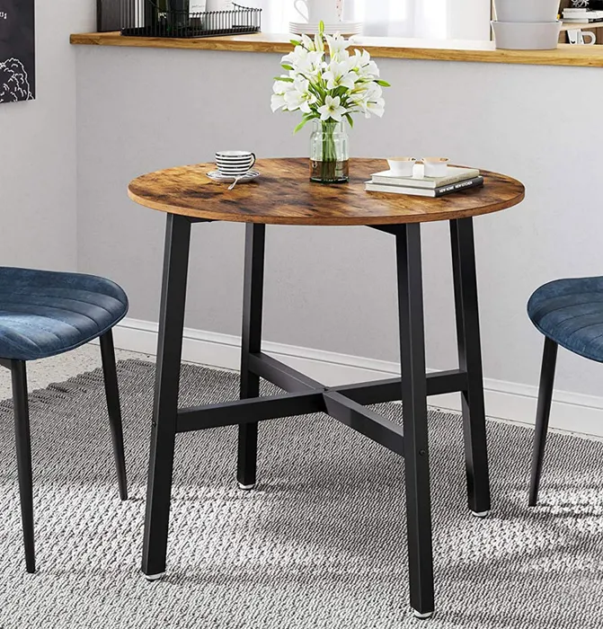 Blat stolika w kolorze rustykalnego brązu wykonano z wysokiej jakości płyty wiórowej odpornej na uszkodzenia mechaniczne. Metalowe nogi połączone ze sobą na krzyż stalowym stelażem dla wzmocnienia stolika pokryto specjalistycznym odpornym na zarysowani i zadrapania. Dzięki okrągłemu kształtowi blatu jest on bezpieczny dla dzieci. Maksymalne obciążenie mebla wynosi aż 100 kg.