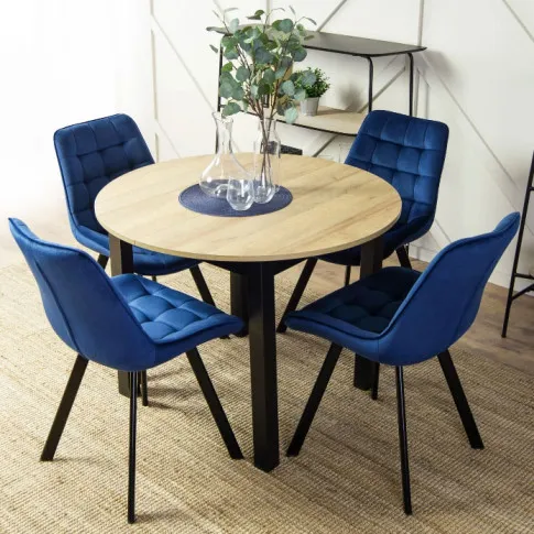 Rozkładany okrągły stół z 4 welurowymi granatowymi krzesłami Flegris