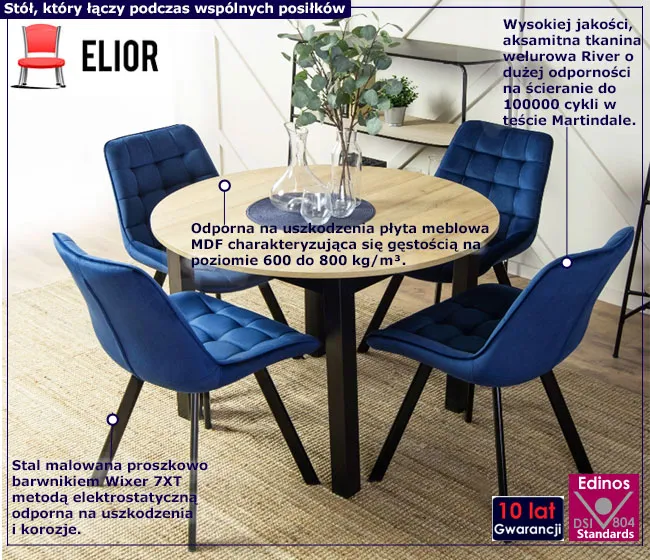 Wyobraź sobie, że siedzisz w luksusowym hotelu, w eleganckiej restauracji. Wokół Ciebie panuje atmosfera szyku i wyrafinowania, ale wciąż jest przytulnie. Na stole stoi świeży bukiet kwiatów, a w powietrzu unosi się zapach wyśmienitej kuchni. A teraz wyobraź sobie, że możesz przenieść tę atmosferę do swojego domu. Dzięki zestawowi Flegris marki Edinos Premium to możliwe! Okrągły stół będzie centralnym punktem Twojej jadalni, a cztery welurowe krzesła sprawią, że każdy posiłek będzie smakował jeszcze lepiej!