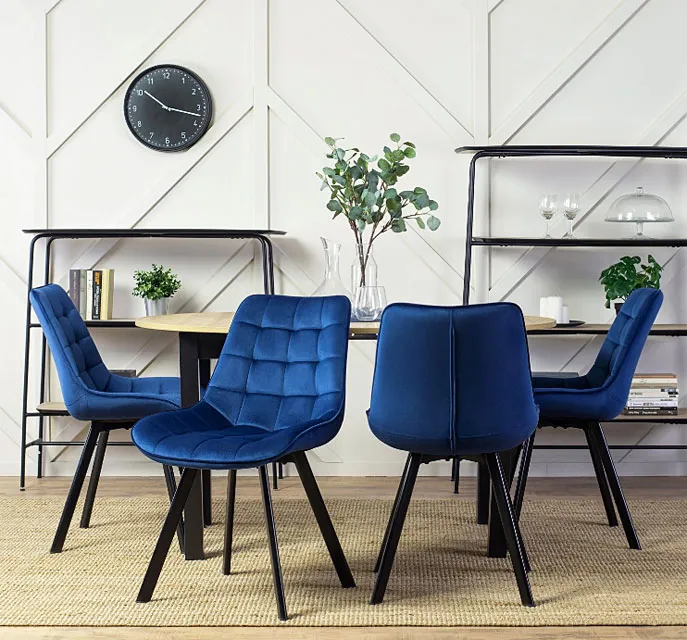 • cztery welurowe krzesła z pięknymi pikowaniami na siedzisku i oparciu zapewniają komfort siedzenia