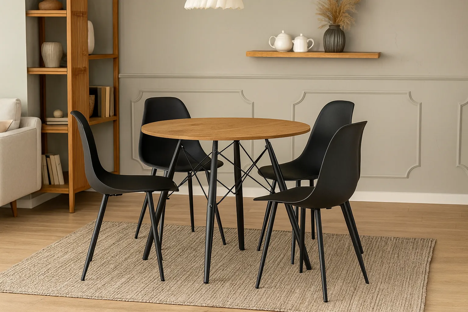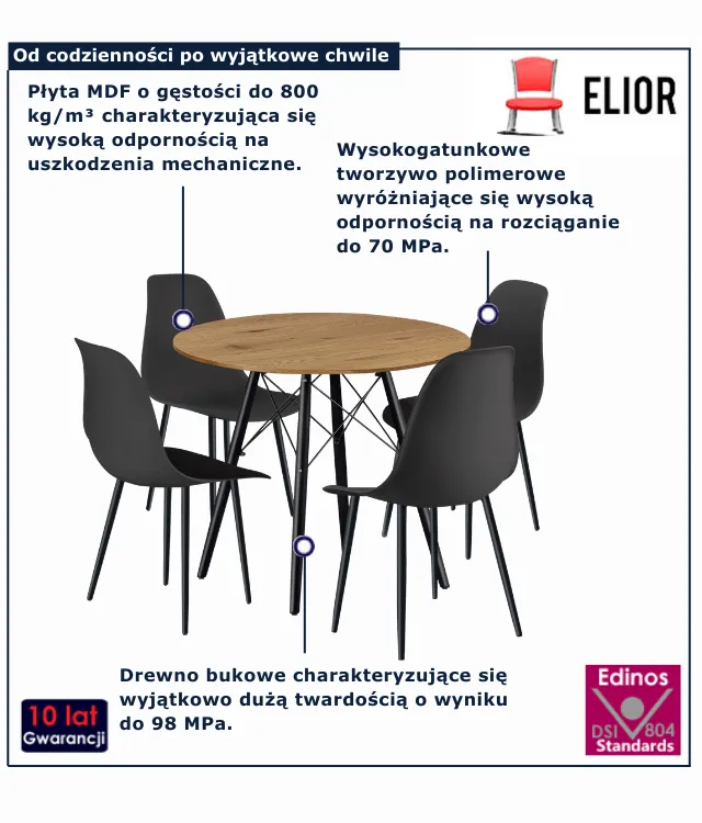 • Komplet, który łączy styl i praktyczność – okrągły stół oraz dopasowane krzesła tworzą spójną całość, idealną do codziennych posiłków i wyjątkowych okazji.