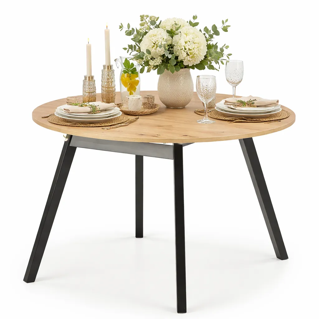 Stół został wykonany z płyty meblowej okleinowej zbudowanej z włókien drzewnych i związków organicznych w warunkach wysokiego ciśnienia i temperatury. Włókna ułożone są różnokierunkowo, o strukturze sinusoidalnej, co zapewnia nadanie jej cech jakościowych oraz wytrzymałościowych. Dodatkowo płyta została uszlachetniona cienkimi filmami melaminowymi w celu zwiększenia jej trwałości. Brzegi mebla oklejono specjalistycznym materiałem ABS, cechującym się ponadprzeciętną odpornością na zarysowania. Wykorzystano również drewno lite - bukowe charakteryzującego się wysoką gęstością na poziomie do 720 mg/m3 oraz wyjątkowo dużą twardością o wyniku do 98 MPa w pomiarach metodą Janki. Te cechy powodują, że drewno bukowe jest idealnym surowcem do wyrobu mebli. Blat stołu wykonano w kolorze dąb artisan stojącego na stabilnych czarnych nogach.