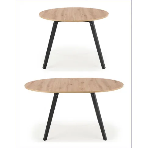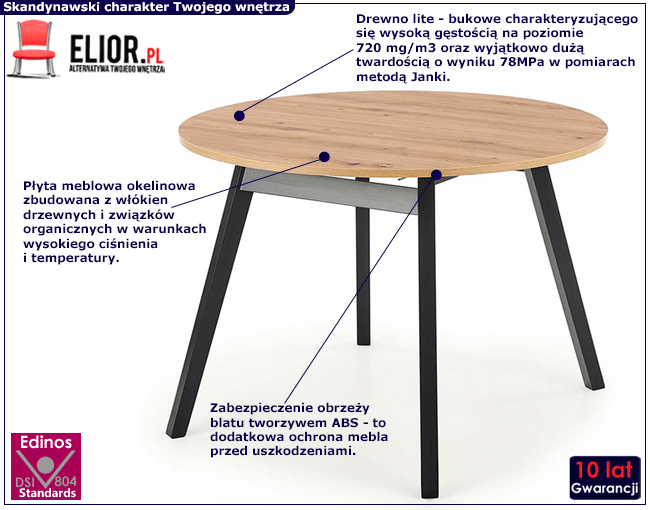 Stół został wykonany z płyty meblowej okleinowej zbudowanej z włókien drzewnych i związków organicznych w warunkach wysokiego ciśnienia i temperatury. Włókna ułożone są różnokierunkowo, o strukturze sinusoidalnej, co zapewnia nadanie jej cech jakościowych oraz wytrzymałościowych. Dodatkowo płyta została uszlachetniona cienkimi filmami melaminowymi w celu zwiększenia jej trwałości. Brzegi mebla oklejono specjalistycznym materiałem ABS, cechującym się ponadprzeciętną odpornością na zarysowania. Wykorzystano również drewno lite - bukowe charakteryzującego się wysoką gęstością na poziomie do 720 mg/m3 oraz wyjątkowo dużą twardością o wyniku do 98 MPa w pomiarach metodą Janki. Te cechy powodują, że drewno bukowe jest idealnym surowcem do wyrobu mebli. Blat stołu wykonano w kolorze dąb artisan stojącego na stabilnych czarnych nogach.