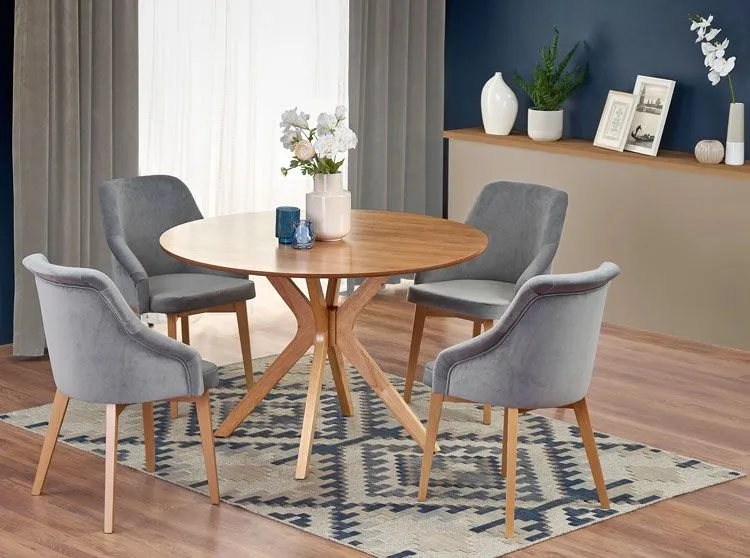 Stół Froser to kwintesencja klasyki i elegancji z nutką nowoczesności podana w minimalistycznej formie. Jeśli dobrze czujesz się w spokojnych wnętrzach bez zbędnego przepychu to znak, że powinieneś mieć ten stół w swoim domu. Proste formy i stonowane kolory wprowadzają do wnętrza harmonię, spokój i łagodny, urzekający klimat. Stół Froser jest idealną propozycją zarówno do salonu, jadalni jak i kuchni. W każdym pomieszczeniu sprawdzi się jako praktyczny i funkcjonalny stół przy którym z nieskrywaną przyjemnością zjesz posiłek z najbliższymi i wypijesz poranną kawę. Będzie też genialnym rozwiązaniem do pokoju młodzieżowego czy pokoju dziennego. Spektakularnie dopełni wnętrza w stylu minimalistycznym, nowoczesnym oraz skandynawskim. Zachowując swoją prostą i wdzięczną formę posiada oryginalne nogi, które zwracają na siebie uwagę swoim nietypowym, pięknym kształtem. To dzięki nim stół nie znika wśród innych mebli, a staje się widocznym, przyciągającym wzrok elementem aranżacji. Okrągły blat przywołuje swoim urokiem i zaprasza do siebie wszystkich wokół. Czy i Ty dasz mu się skusić? Przekonaj się sam, wybierając go do swojego wnętrza.