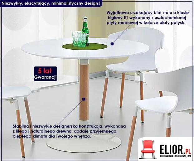 Wyjątkowe piękno i niezwykły design zamknięty w modnej, białej barwie oraz naturalnym drewnie. Dodaj do Swojego wnętrza szczyptę nieziemskiego uroku i doskonałego stylu! Prezentujemy Ci jakże efektowny wizualnie i bardzo praktyczny w użytkowaniu stół Korti marki Elior. Mebel wykonany został z naturalnej płyty meblowej oraz wysokiej jakości litego drewna bukowego. Spokój płynący z niezwykłej formy stołu Korti rozpali w Tobie nowe pokłady inspiracji, a Twoje wnętrze nabierze nowego, naturalnego designu. Łyk każdej kawy wypitej przy stole Korti doda Ci harmonii oraz pozwoli odetchnąć od codziennego chaosu i pośpiechu.