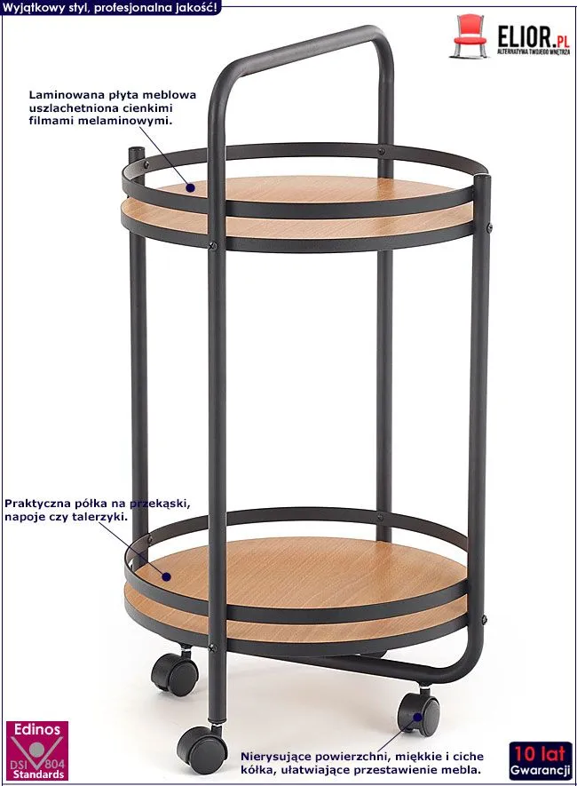 Barek na kółkach Igla to nie tylko wysoka funkcjonalność. Projektanci marki Elior zadbali również o wykorzystanie starannie wyselekcjonowanych materiałów. Oba blaty mebla wyprodukowano z najwyższej jakości laminowanej płyty MDF o klasie higieny E1 w kolorze naturalnego drewna, uszlachetnionej cienkimi filmami melaminowymi. Posiada także specjalne włókna ułożone różnokierunkowo o strukturze sinusoidalnej, co zapewnia nadanie jej cech jakościowych oraz wytrzymałościowych. Czarną konstrukcję stolika stworzono z najwyższej jakości nierdzewnej stali malowanej odpornym na zarysowania i zadrapania. Najwyższa jakość techniki polimeryzacji pozwoliła zaoferować firmie Elior aż 10 lat gwar. na swoje produkty. Już nie musisz się martwić, że po kilku latach część farby odpryśnie od mebla . Użycie tych wysokojakościowych materiałów znacząco wydłuża czas eksploracji mebla. Stolik barowy Igla przetrwa więc w nienaruszonym stanie niejedną imprezę do białego rana!