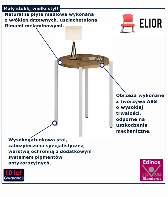 • Produkt posiada certyfikat jakości "Edinos Standards DSI 804", który potwierdza najwyższą jakość wykonania mebla oraz pełny stopień zgodności poszczególnych jednostek wytworzonego wyrobu z przyjętym wzorcem.
