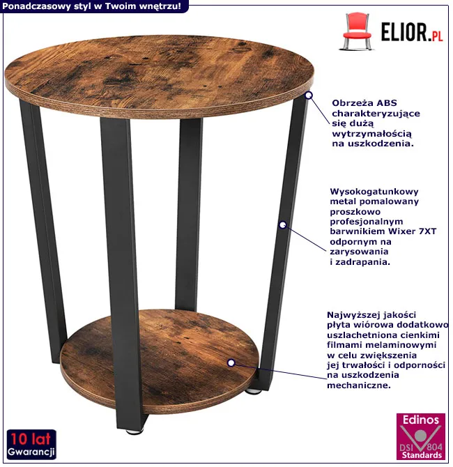 Loftowy stolik Aramis marki Edinos Premium to ponadczasowy design, który będzie niezwykłą ozdobą Twojego wnętrza. Gładka okrągła krawędź sprawdzi się zwłaszcza w pomieszczeniach, gdzie przebywają małe dzieci, ponieważ gwarantuje ich bezpieczeństwo. Dodatkowa dolna półka z pewnością przyda Ci się, by odłożyć ulubione czasopismo lub książkę. Stolik Aramis jest także niezwykle funkcjonalny, ponieważ możesz go wykorzystać jako szafkę nocną przy łóżku w sypialni. Wybierz stylowy industrialny mebel, który z pewnością doda niezwykłego smaku Twojej niepowtarzalnej przestrzeni.