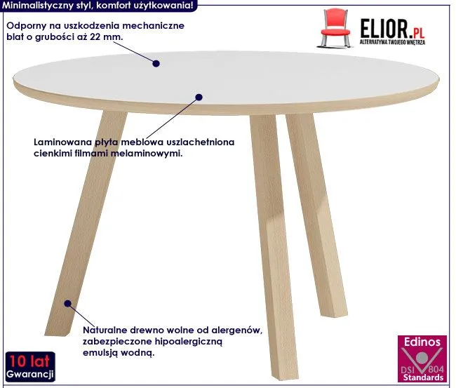 Przedstawiamy Ci zachwycającą ławę Ivos 2X marki Elior. Wyróżnia się ona nie tylko swoją praktyczną formą i efektownym kształtem, ale także zastosowaniem materiałów najlepszej jakości. To dlatego cieszy się powodzeniem wśród osób lubiących nowatorskie rozwiązania. Designerski, okrągły blat stolika w kolorze białym wykonany został z laminowanej płyty meblowej o klasie higieny E1, uszlachetnionej cienkimi filmami melaminowymi. Posiada także specjalne włókna ułożone różnokierunkowo o strukturze sinusoidalnej, co zapewnia nadanie jej cech jakościowych oraz wytrzymałościowych. Nogi mebla wyprodukowano z naturalnego drewna wolnego od alergenów, a następnie zabezpieczonego hipoalergiczną emulsją wodną. Gwarantuje to ławie ponadprzeciętną trwałość i niepodatność na uszkodzenia. Stonowana kolorystyka i prosta forma sprawiają, że stolik kawowy Lindo doskonale sprawdza się we wnętrzach urządzonych w stylu skandynawskim, jak też minimalistycznym czy nowoczesnym. Świetnie nadaje się także do wnętrz dziecięcych czy młodzieżowych. Ława zapewnia Ci niezapomniane chwile przy kawie w gronie przyjaciół i rodziny. Wnieś do swojego wnętrza nastrojowy klimat, harmonizując go z czystością prawdziwej bieli!