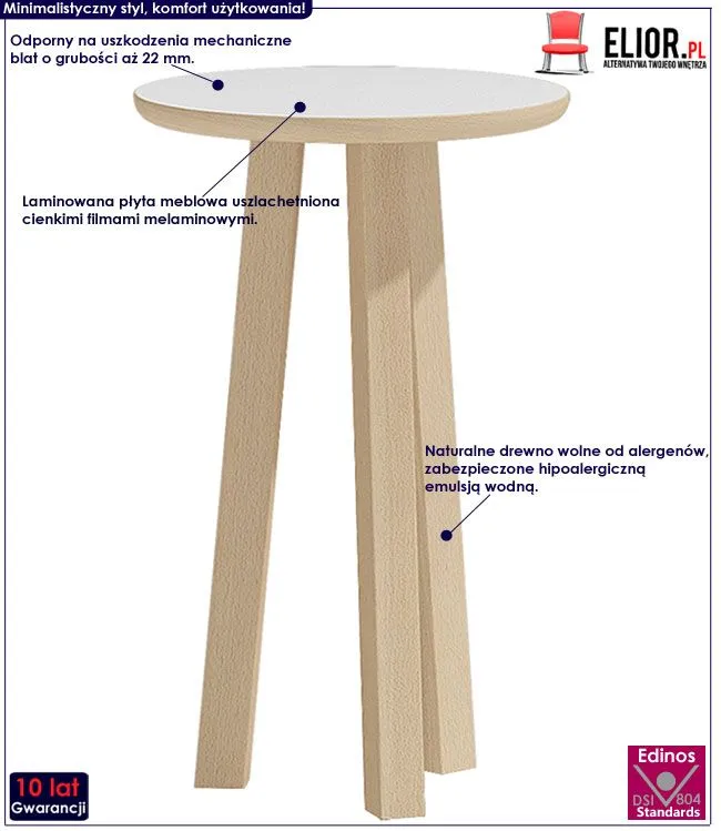Przedstawiamy Ci zachwycającą ławę Ivos 5X marki Elior. Wyróżnia się ona nie tylko swoją praktyczną formą i efektownym kształtem, ale także zastosowaniem materiałów najlepszej jakości. To dlatego cieszy się powodzeniem wśród osób lubiących nowatorskie rozwiązania. Designerski, okrągły blat stolika w kolorze białym wykonany został z laminowanej płyty meblowej o klasie higieny E1, uszlachetnionej cienkimi filmami melaminowymi. Posiada także specjalne włókna ułożone różnokierunkowo o strukturze sinusoidalnej, co zapewnia nadanie jej cech jakościowych oraz wytrzymałościowych. Nogi mebla wyprodukowano z naturalnego drewna wolnego od alergenów, a następnie zabezpieczonego hipoalergiczną emulsją wodną. Gwarantuje to ławie ponadprzeciętną trwałość i niepodatność na uszkodzenia. Stonowana kolorystyka i prosta forma sprawiają, że stolik kawowy Lindo doskonale sprawdza się we wnętrzach urządzonych w stylu skandynawskim, jak też minimalistycznym czy nowoczesnym. Świetnie nadaje się także do wnętrz dziecięcych czy młodzieżowych. Ława zapewnia Ci niezapomniane chwile przy kawie w gronie przyjaciół i rodziny. Z powodzeniem sprawdza się również jako czarujący kwietnik. Wnieś do swojego wnętrza nastrojowy klimat, harmonizując go z czystością prawdziwej bieli!
