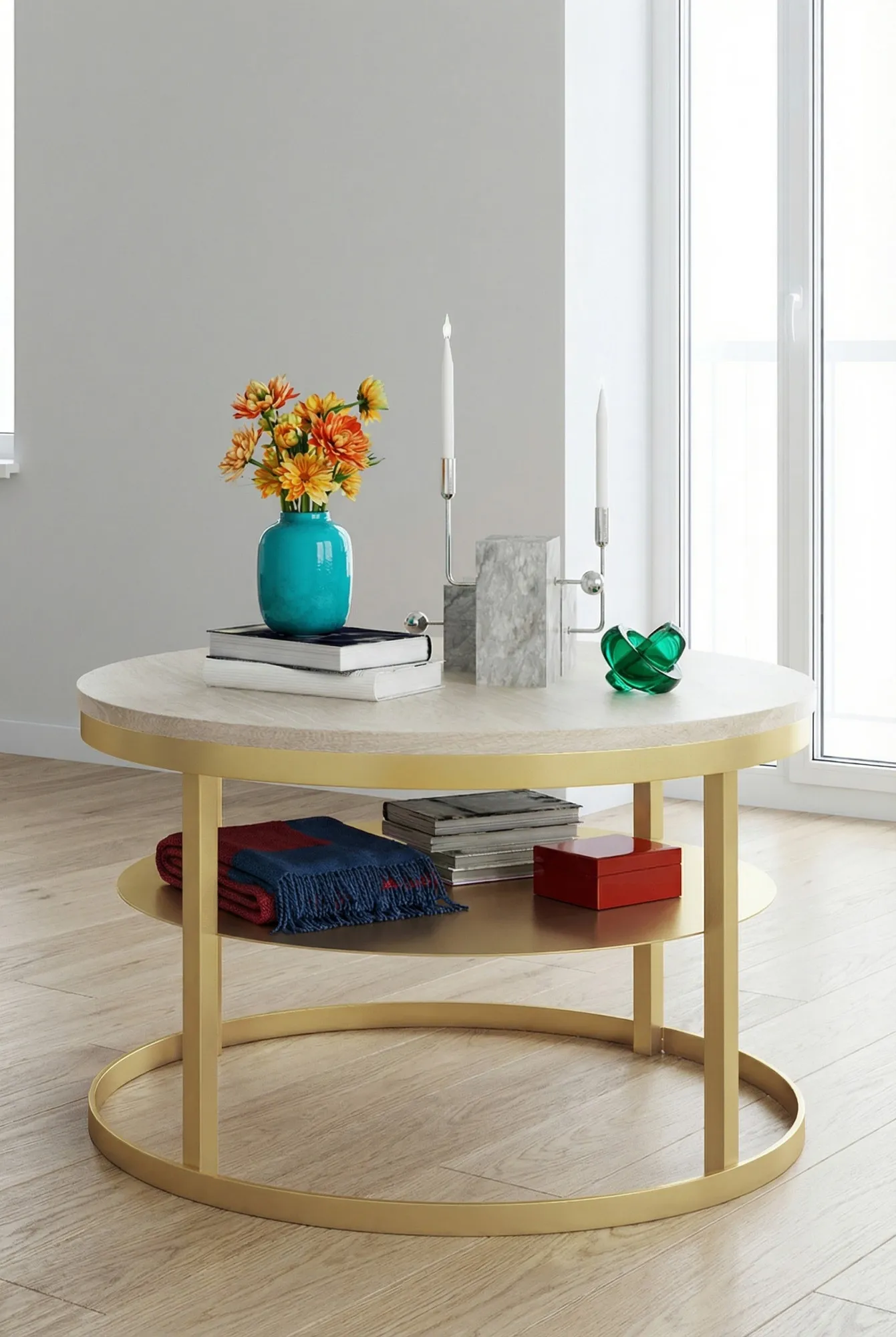 Okrągły stolik kawowy Selpa 3X złoty+dąb sonoma