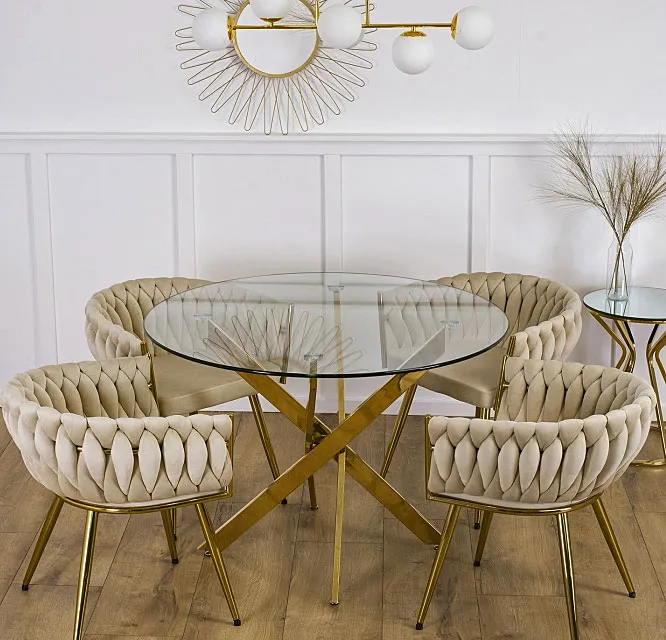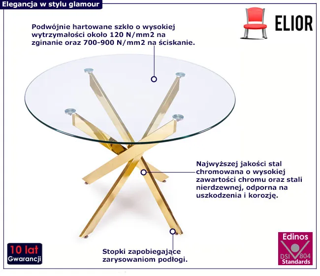Chcesz się przenieść w świat elegancji i luksusu? Chcesz, by Twój salon emanował ekskluzywną aurą? Jeśli tak, to postaw w nim przepiękny stół Amira marki Edinos Premium. To wytworne dzieło sztuki zamknięte w formie praktycznego mebla. Szklany, okrągły blat połączony ze złotą, chromowaną podstawą tworzą doskonałą kompozycję w stylu glamour. To stół, który przemienia zwykłe spotkania w prawdziwe uczty dla zmysłów.