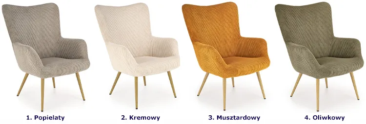 4 modne kolory: Popielaty, Kremowy, Musztardowy, Oliwkowy. Sprawdź naszą ofertę i wybierz swój ulubiony kolor fotela Koneris.