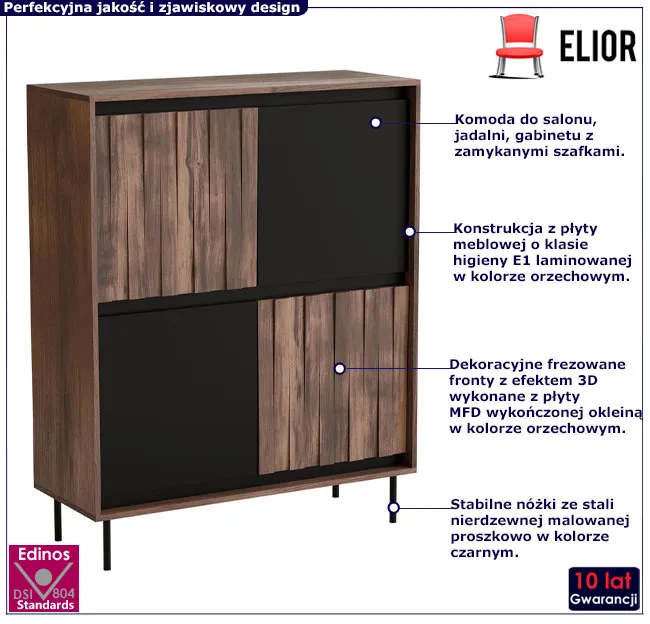 • Modny kolor: Orzech + czarny. Kliknij w link i sprawdź także inne komody na nóżkach w sklepie Edinos.pl. Stwórz swój praktyczny zestaw mebli.