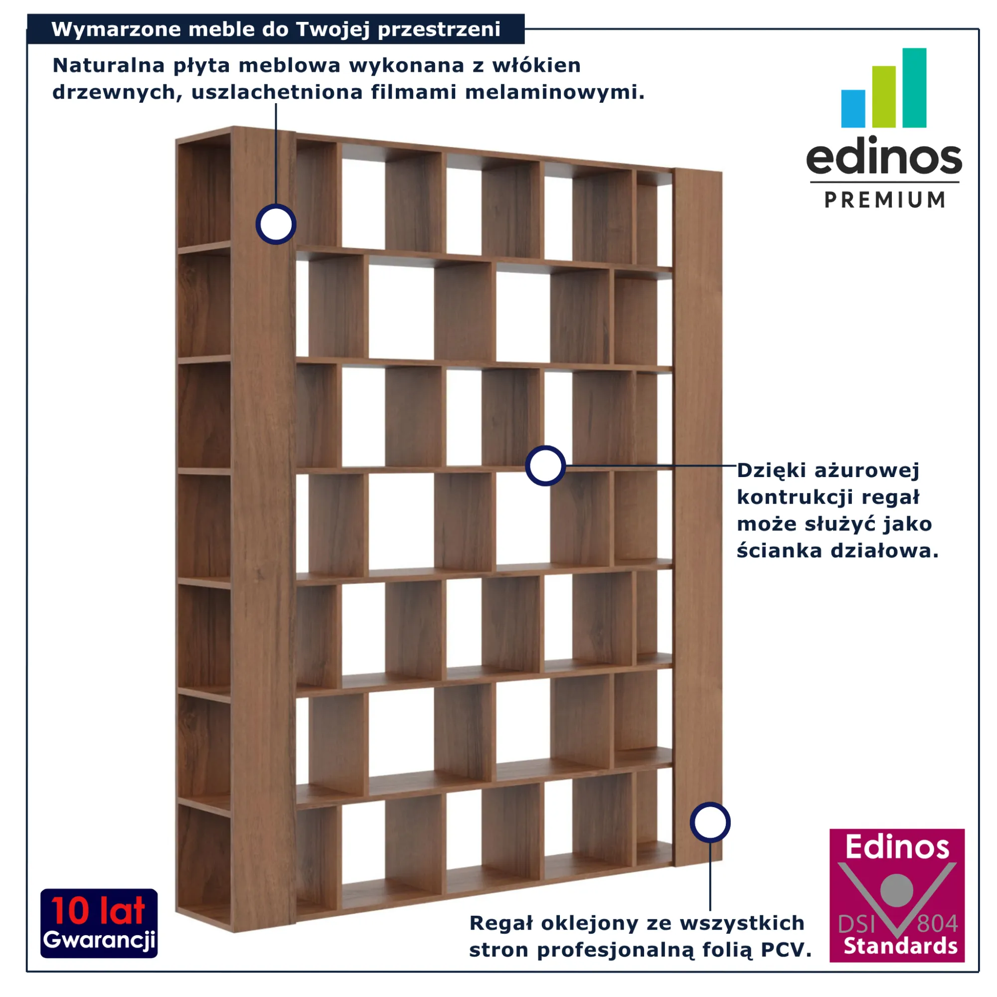 • Produkt posiada certyfikat jakości "Edinos Standards DSI 804", który potwierdza najwyższą jakość wykonania mebla oraz pełny stopień zgodności poszczególnych jednostek wytworzonego wyrobu z przyjętym wzorcem.