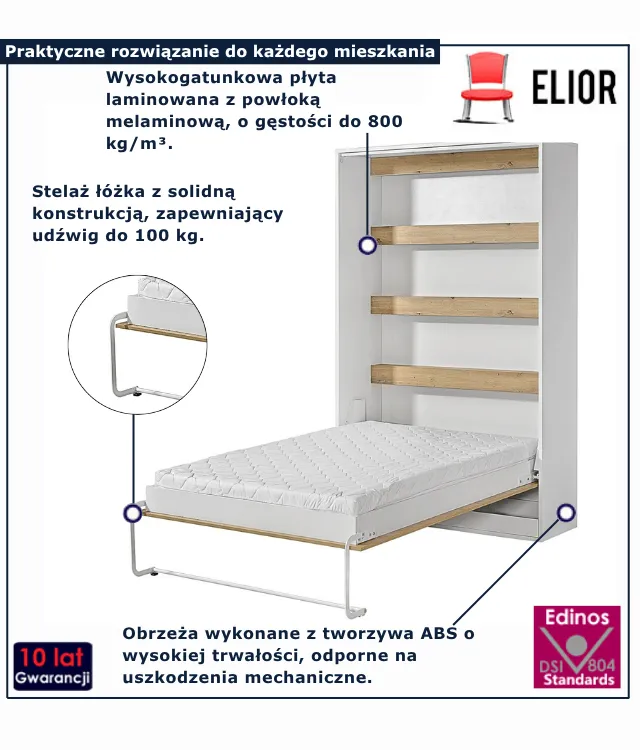 • Produkt posiada certyfikat jakości "Edinos Standards DSI 804", który potwierdza najwyższą jakość wykonania mebla oraz pełny stopień zgodności poszczególnych jednostek wytworzonego wyrobu z przyjętym wzorcem.
