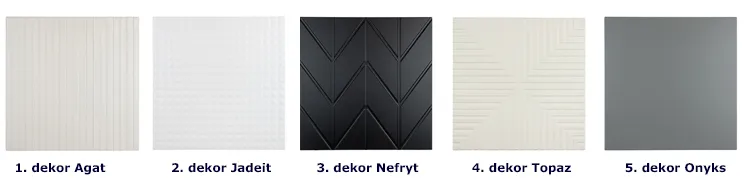 • Fronty szafek – 2 wymiary frontów w 5 wzorach inspirowanych urodą kamieni szlachetnych i 5 modnych kolorach. Ta opcja pozwoli Ci zdecydować, czy Twój mebel będzie zabudowany, otwarty czy półotwarty.