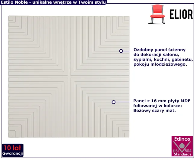 • Produkt posiada certyfikat jakości "Edinos Standards DSI 804", który potwierdza najwyższą jakość wykonania mebla oraz pełny stopień zgodności poszczególnych jednostek wytworzonego wyrobu z przyjętym wzorcem.