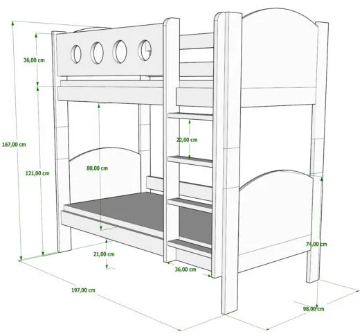 - Zestaw składa się z: piętrowego łóżka o wymiarach 190x90 cm, dwóch drewnianych stelaży, dwóch materacy piankowych dopasowanych pod wymiar łóżka oraz jednej pojedynczej lub dwóch mniejszych szuflad. Informację o wybranej opcji szuflad prosimy przekazać w wiadomości do sprzedającego przy zakupie lub drogą mailową. Jeżeli potrzebujesz łóżka bez szuflad widocznego na wizualizacji kliknij tutaj.
