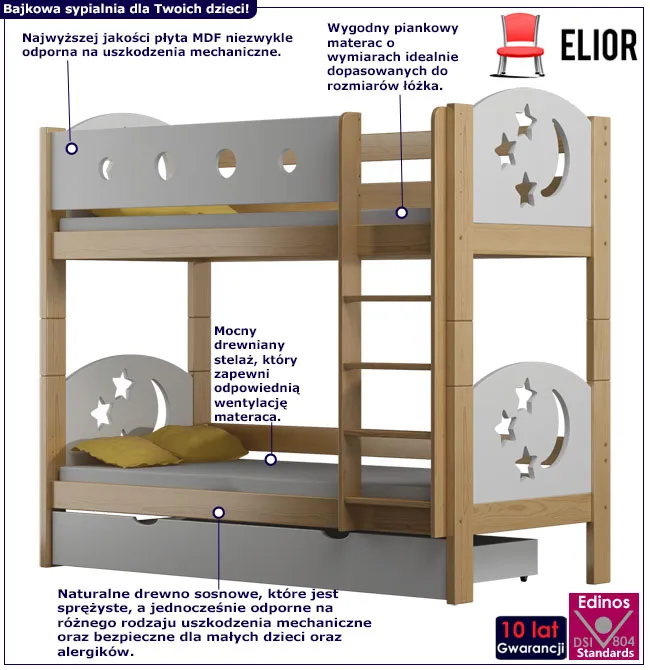 Łóżko Iwaria 4X to zaokrąglone krawędzie, gładka szlifowana powierzchnia, barierki bezpieczeństwa i naturalne drewno sosnowe. Dokładnie szlifowana powierzchnia materiału zabezpieczona została naturalnym impregnatem ochronnym, który chroni przed zarysowaniem oraz przetarciem drewna. Emulsje ochronne marki Elior produkowane na bazie wody są całkowicie wolne od formaldehydu, dzięki czemu charakteryzują się neutralnym zapachem. Natomiast drewno sosnowe jest sprężyste, a jednocześnie odporne na różnego rodzaju uszkodzenia mechaniczne. Ponadto sosna ma dobroczynny wpływ na ludzkie zdrowie. I tu uwaga: sosna wykazuje właściwości higroskopijne – reguluje poziom wilgotności powietrza przez pochłanianie i oddawanie pary wodnej do otoczenia. Dodatkowo sosna ma właściwości elektrostatyczne, a więc nie tylko nie przyciąga kurzu, ale zapobiega również jego kłębieniu się w powietrzu. Zagłówki i barierki wykonano z najwyższej jakości płyty MDF niezwykle odpornej na uszkodzenia mechaniczne. W zestawie dostajesz również dwa wygodne piankowe materace. To łóżko dostosowano tak, aby zapewnić Twoim dzieciom najwyższy komfort spania.