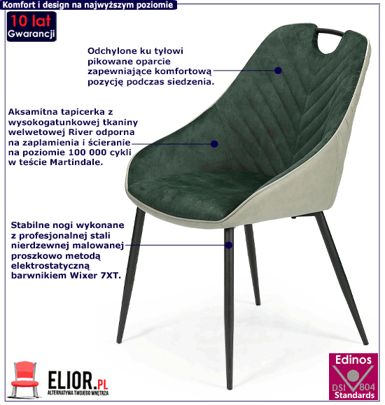 Krzesło Mofo to nie tylko idealny mebel aby odzwierciedlić Twoją fantastyczną osobowość ale też trwały i solidny projekt o mocnej konstrukcji. Marka Elior kładzie niesamowity nacisk na dobór odpowiednich materiałów, a w późniejszym etapie na precyzję wykonania. Naszym priorytetem są Twoje potrzeby i zadowolenie na wiele długich lat. Tworzymy z pasji do piękna nie zapominając o funkcjonalności i najwyższej jakości naszych usług. W przypadku krzesła Mofo nie było inaczej. Abyś mógł cieszyć się niezwykle miękką i trwałą tapicerką, została stworzona z wysokogatunkowej tkaniny River. To niebywale miękka i przyjemna w dotyku wysokogatunkowa tkanina obiciowa typu velvet. Materiał ten jest niesamowicie aksamitny w dotyku, a lekko połyskując dodaje całości szlachetności i wysublimowanej elegancji. River to jeden z francuskich welurów charakteryzujący się bardzo dobrą odpornością na zabrudzenia i ścieranie na poziomie aż do 100 000 cykli w teście Martindale. Idealnie pasująca czarna konstrukcja powstała z najwyższej jakości stali nierdzewnej. Do jej obróbki została wykorzystana nowoczesna metoda elektrostatyczna, dzięki której stal została pomalowana proszkowo wykorzystując barwnik . Technika malowania proszkowego charakteryzuje się dużą trwałością, odpornością na korozje oraz uszkodzenia mechaniczne, co znacznie podnosi walory zarówno użytkowe jak i estetyczne mebla. Takim sposobem krzesło Mofo jest w pełni przygotowane aby zagościć w Twoim świecie dając Ci mnóstwo satysfakcji. Niezwykły komfort i oryginalna dekoracja Twojego wnętrza to jego główne zadania, które wykona perfekcyjnie. Zacznij więc metamorfozę swojej przestrzeni i ciesz się życiem razem z marką Elior!