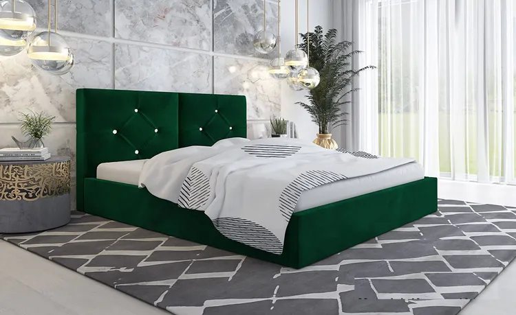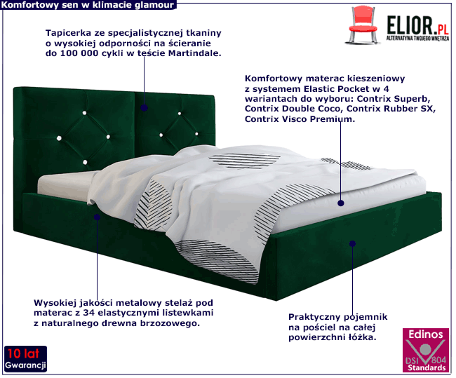 Podwójne tapicerowane łóżko Erdi 3X to unikatowy projekt młodych, zdolnych designerów marki Elior. Łóżko Erdi 3X zostało stworzone z potrzeby połączenia totalnej wygody i komfortu z niebanalnym wzornictwem spod znaku glamour. Podstawę łóżka Erdi 3X stanowi mocna skrzynia o grubości 1,6 mm, wykonana z drewna naturalnego i płyty meblowej zbudowanej z włókien drzewnych i związków organicznych. Dodatkowo, płyta została uszlachetniona cienkimi filmami melaminowymi w celu zwiększenia jej trwałości. Na skrzyni obłożonej profesjonalną pianką o grubości T25 i tapicerowanej szlachetną tkaniną welwetową lub ekoskórą opiera się doskonały jakościowo metalowy stelaż o maksymalnym obciążeniu aż do 200 kg, otwierany za pomocą nowoczesnych podnośników gazowych. Stelaż wykonany z 34 sprężynujących listewek z naturalnego drewna brzozowego ułatwia cyrkulację powietrza pod materacem, co pozytywnie wpływa na jakość snu oraz wydłuża żywotność materaca. W ramie łóżka mieści się pojemnik na pościel, wykonany z mocnej tkaniny technicznej, mocowany za pomocą rzepów. To praktyczne rozwiązanie doskonale uzupełnia walory użytkowe stanowiąc rewelacyjny sposób na zachowanie porządku w sypialni. Tak zaprojektowane łóżko Erdi 3X marki Elior to synonim najwyższej jakości, wyrafinowanego stylu i komfortowego snu w odsłonie glamour.