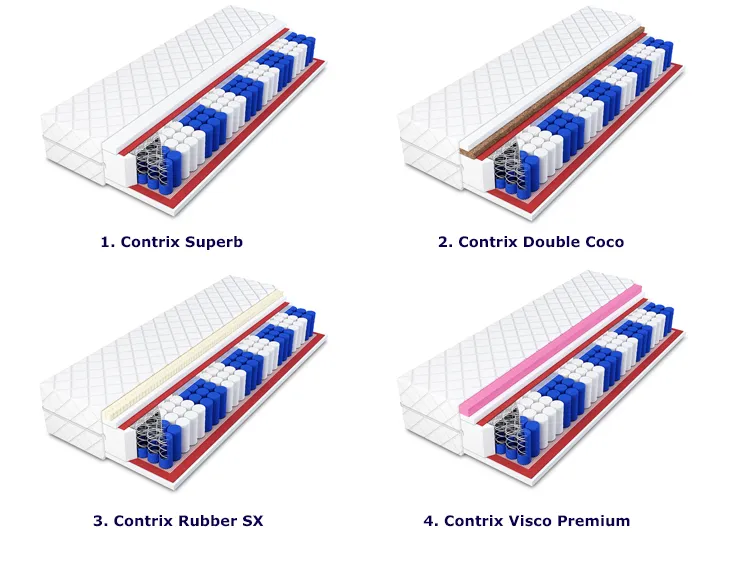 1. Contrix Superb - 17 cm komfortowy materac zbudowany z systemu kieszeni Elastic Pocket, dwustronnie obłożony pianką poliuretanową T25 o zwiększonej elastyczności i odporności na odkształcenia oraz wygniatanie, co zapewnia właściwy odpoczynek i pozytywnie wpływa na komfort snu.